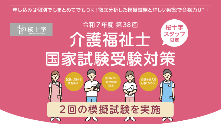2026年1月25日(日)に実施される介護福祉士国家試験を受験予定の方にお知らせです! 今年も受験対策のための模擬試験を実施します! 過去問を徹底分析した本番に近い模擬試験を、桜十字スタッフ限定の特別価格で実施しますので、ぜひご検討ください。 申し込み方法 ①支配人へ申し込み ②電話で申し込み:03-6450-1281(人事直通)※平日9:00~18:00