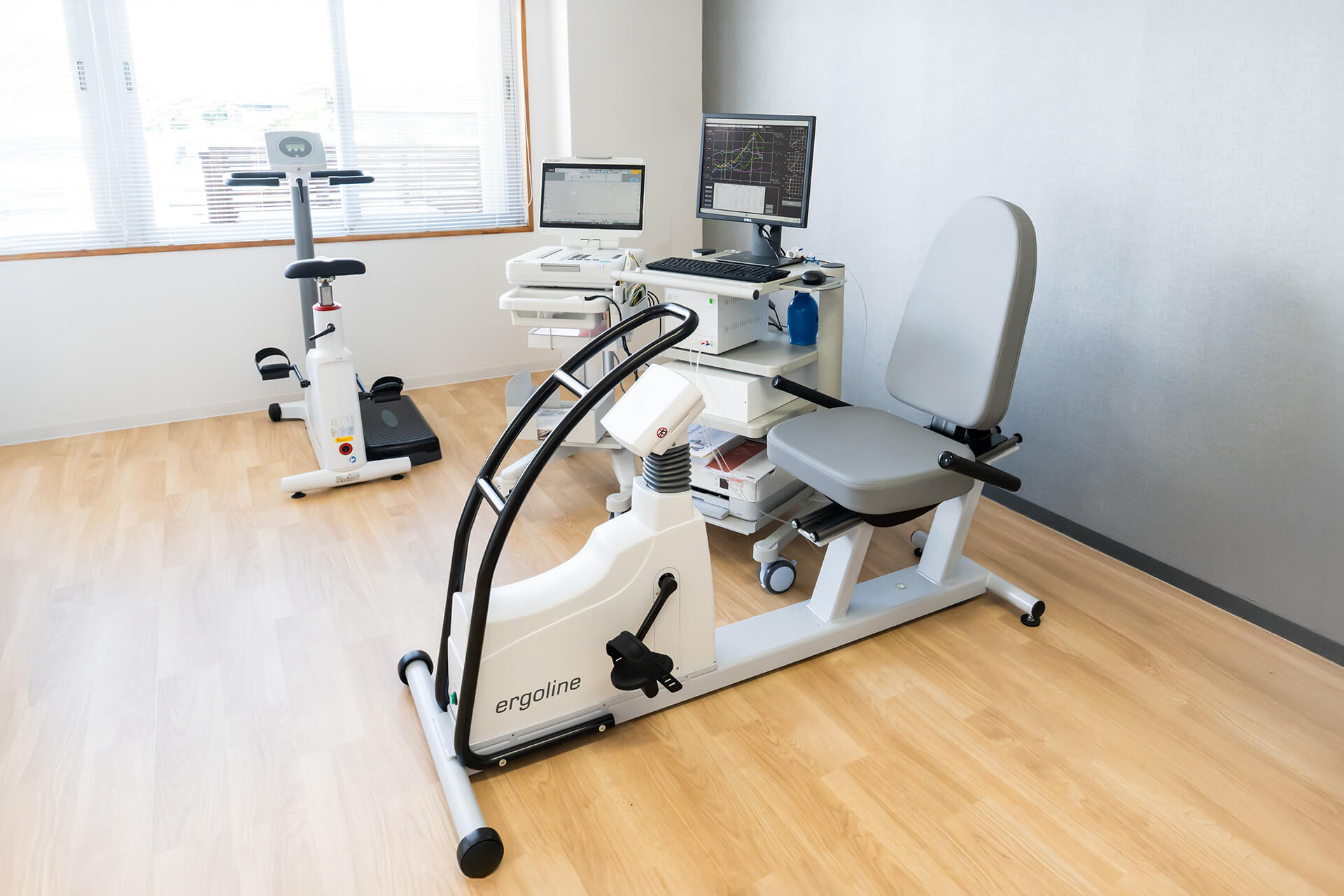 心臓リハビリの第一歩となるのが、CPX(心肺運動負荷試験)です。運動中の心拍や呼吸などを測定することで、患者さまそれぞれに最適な運動強度を見極め、安全で効果的なリハビリ計画につなげています。
