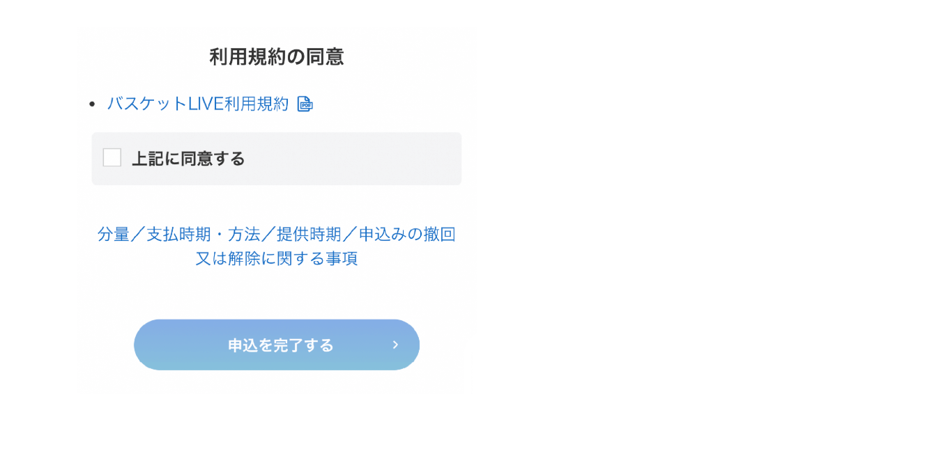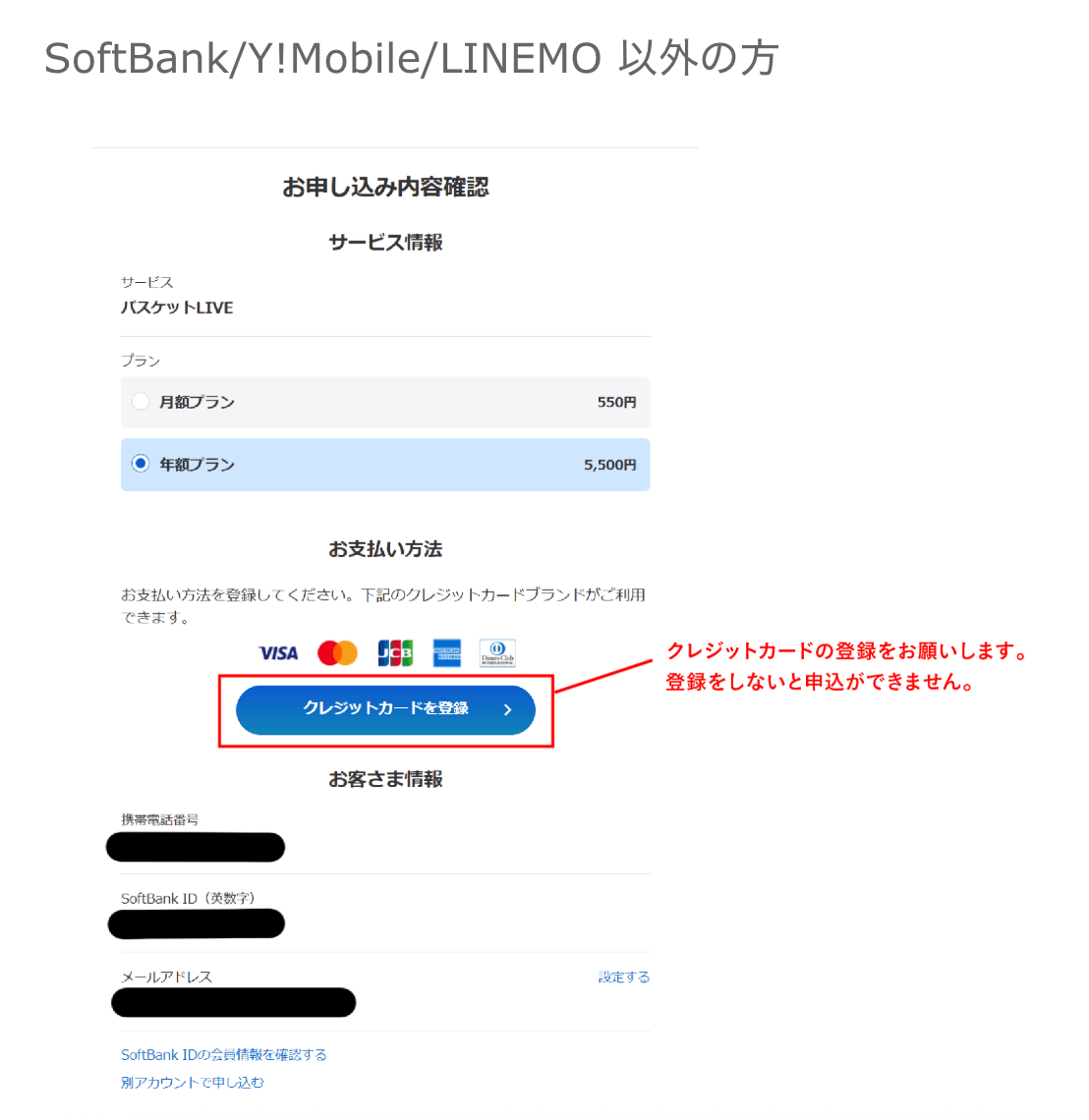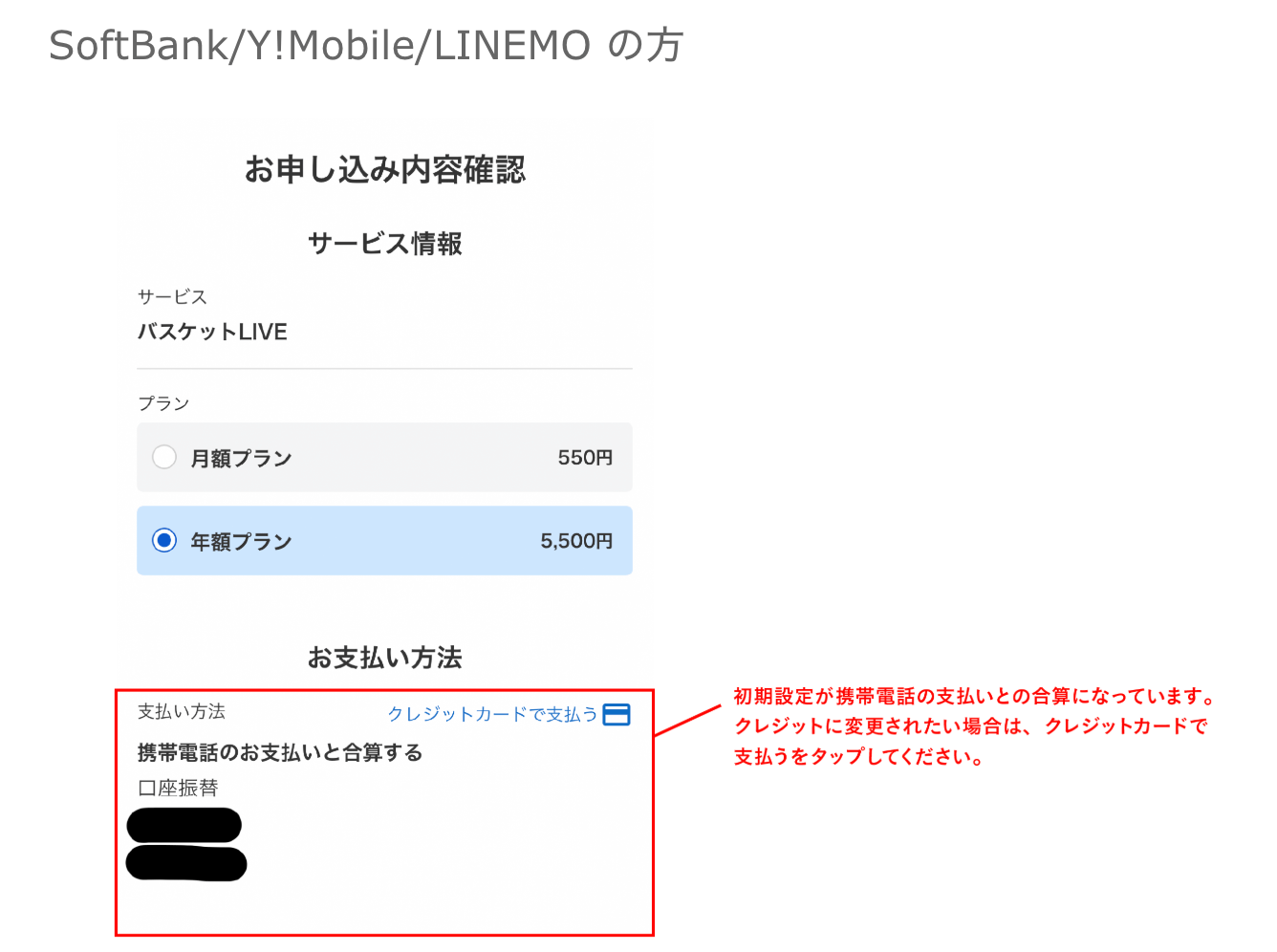※支払い方法を登録しないと申込は出来ません。バスケットLIVEは自動継続となりますので、解約手続きをしない場合、翌年より料金が発生します。SoftBank/Y!Mobile/LINEMOをご利用の方とそれ以外で支払い方法が変わります。詳細は下記をご確認ください。
