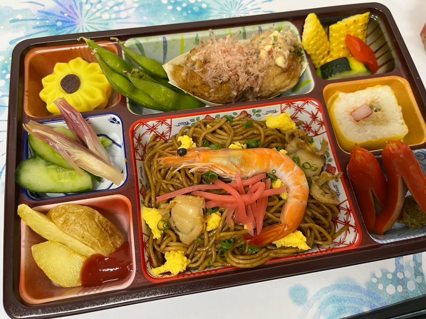 ホスピタルメントでは、毎月一回、料理長が季節ごとの味と香り、そして華やかな見た目にもこだわったお料理で、お客さまに喜んで頂けるように、メニューを作成しています。今回、ホスピタルメント白金の納涼祭では、焼きそば、たこ焼き、枝豆などのお祭りメニューが提供されました。