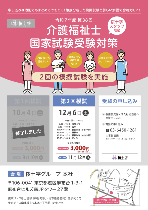 過去問を徹底分析した本番に近い模擬試験を、桜十字スタッフ限定の特別価格で実施しますので、ぜひご検討ください。