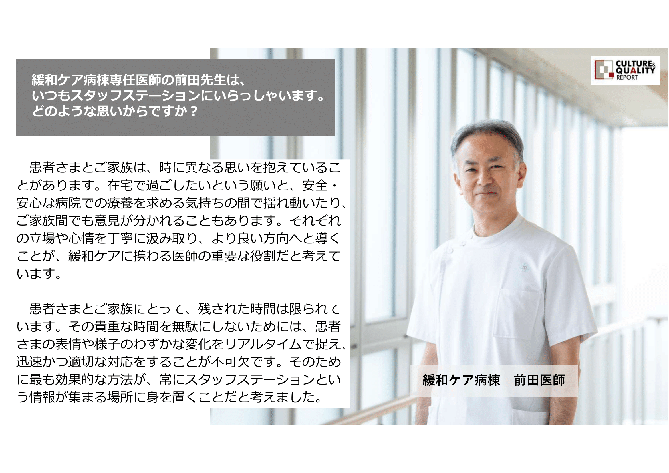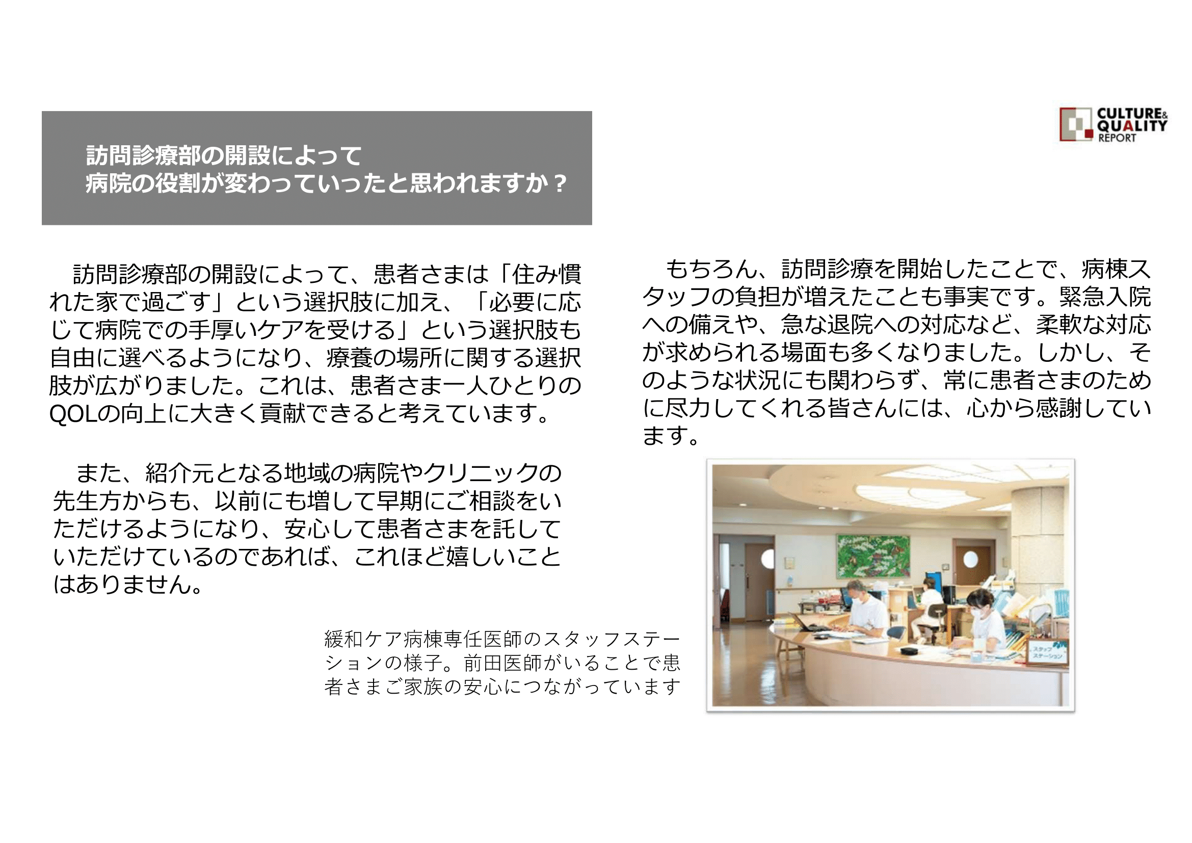 今回は、緩和ケア病棟医師、訪問診療部看護師、看護部長、事務長、院長へインタビューを実施。