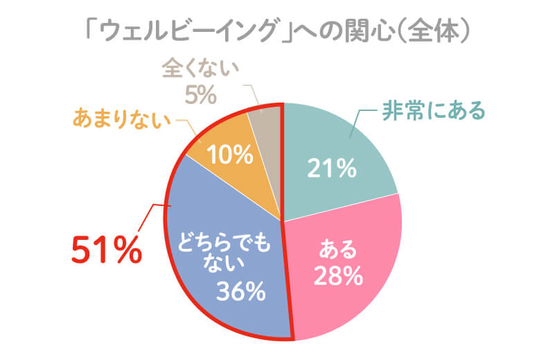 「Well-being」という言葉への関心度では、「非常に関心がある」「関心がある」と回答した人が合計で49%となりました。一方で、51%の人が関心が薄いことが分かりました。今後の情報発信によって、さらに関心を高めていけることが分かりました。