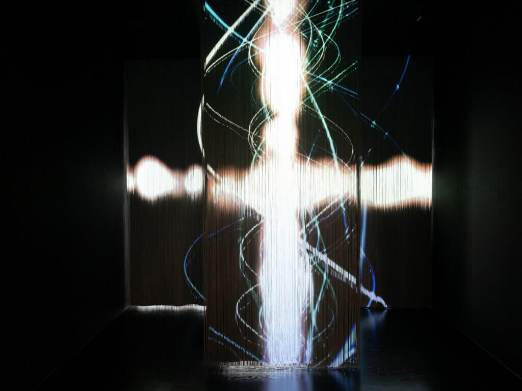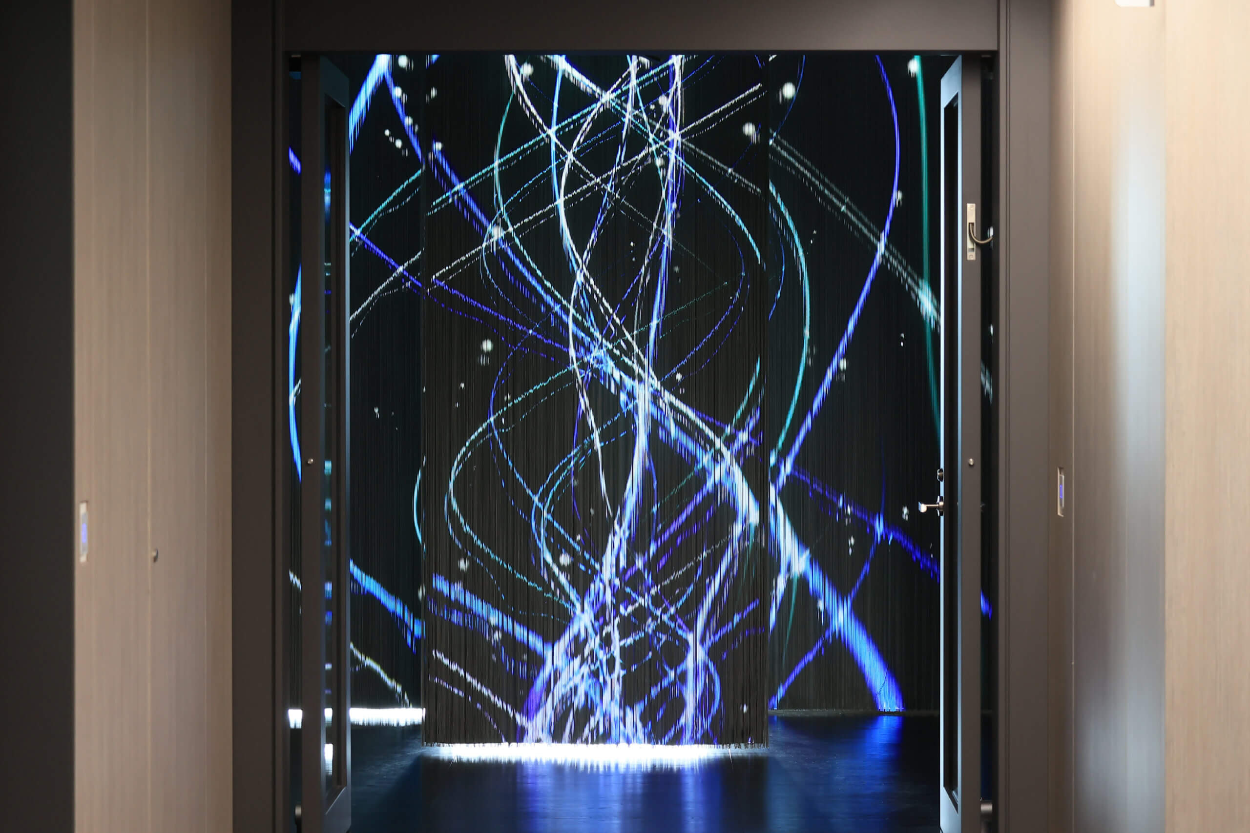 また、エントランスに設けたストリングスカーテンへの立体映像投影によるデジタルアートについても掲載されています。時の流れとともに移ろう“光のらせん”や、来訪者の動きに反応して変化する“光の粒子”が表現されており、新たな挑戦と共創による進化を象徴する空間として紹介されています。