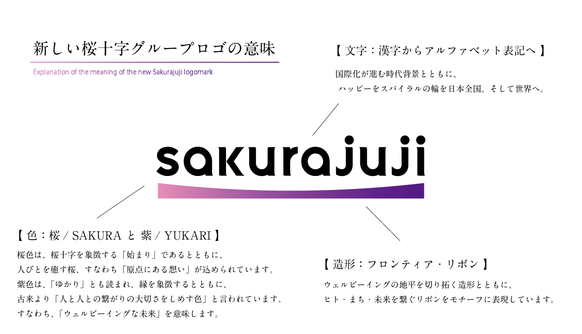 左側の桜色は、人々を癒す「桜」を象徴し、桜十字グループの原点である 桜十字病院の“始まり” を表しています。右側の紫色は、「ゆかり」とも読まれ「縁(つながり)」を象徴する色。「人と人との繋がりを大切にし、豊かな未来の社会を創る」という想いを示しています。