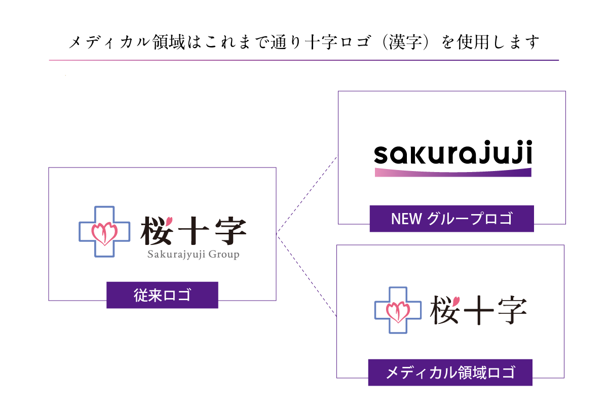 メディカル領域では、新しいグループロゴではなく、これまでのロゴ(またはそれに相当するイメージ)を引き続き使用します。その理由は、患者さま・お客様への配慮です。特に高齢者の方々にとって、新しいデザインはすぐに理解しづらいことがあるため、旧来のロゴを使うことで、見慣れた安心感を保ちつつ、わかりやすい識別性 を維持できます。