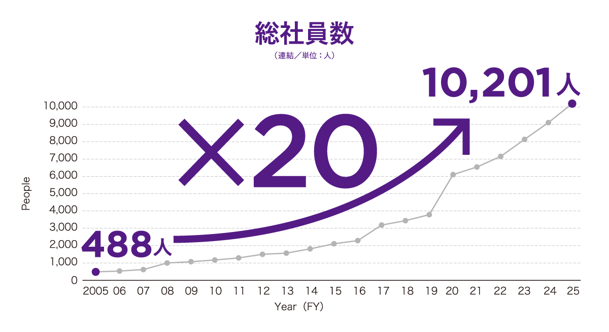 この20年間で、社員数は20倍に増え、メディカルグループ、ヘルスケアグループへと事業を拡大しながら、私たちは一歩ずつ、人々の幸せと豊かさを支えてきました。そして今、私たちは次の10年に向けて、身体的・精神的・社会的に満たされた「Well-being」な未来を切り拓く開拓者(フロンティア)として歩み始めています。