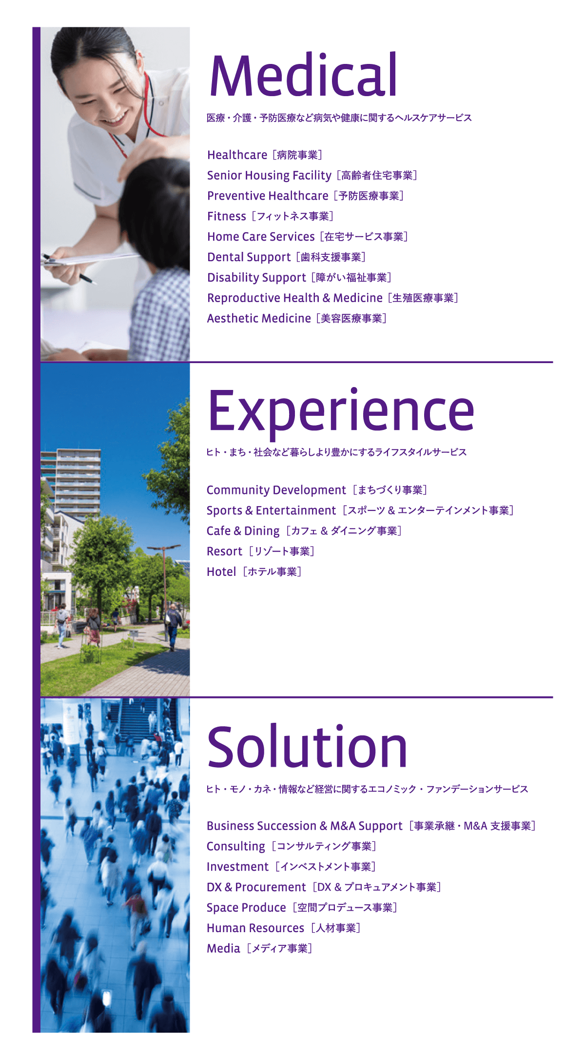 医療から、人々の健康と豊かさにつながるあらゆる事業へと領域を広げ、企業再生・事業創造・社会創生を通じて、どこまでも人生100年時代の「生きるを満たす。」 ことを目指します。