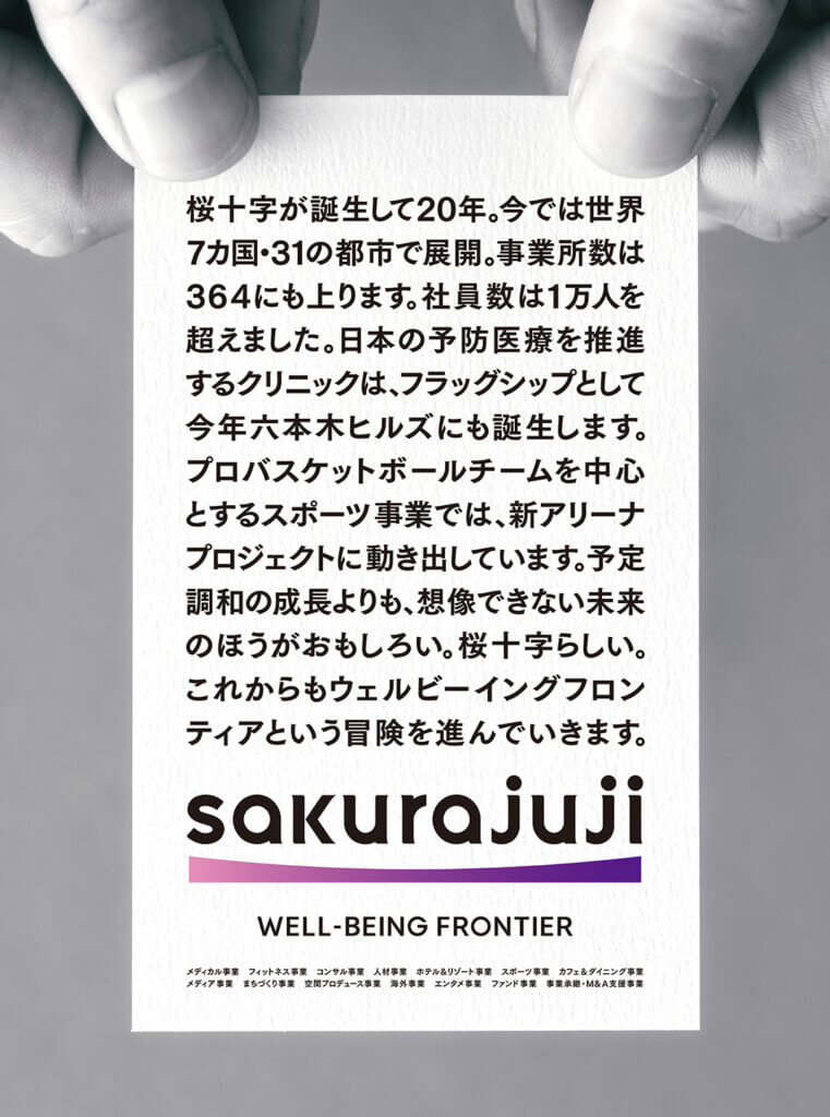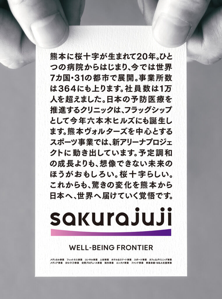 人生100年時代のまだ見ぬ領域を切り拓く開拓者(フロンティア)として。 このCMには、桜十字グループが目指す未来と、挑戦し続ける姿勢が込められています。