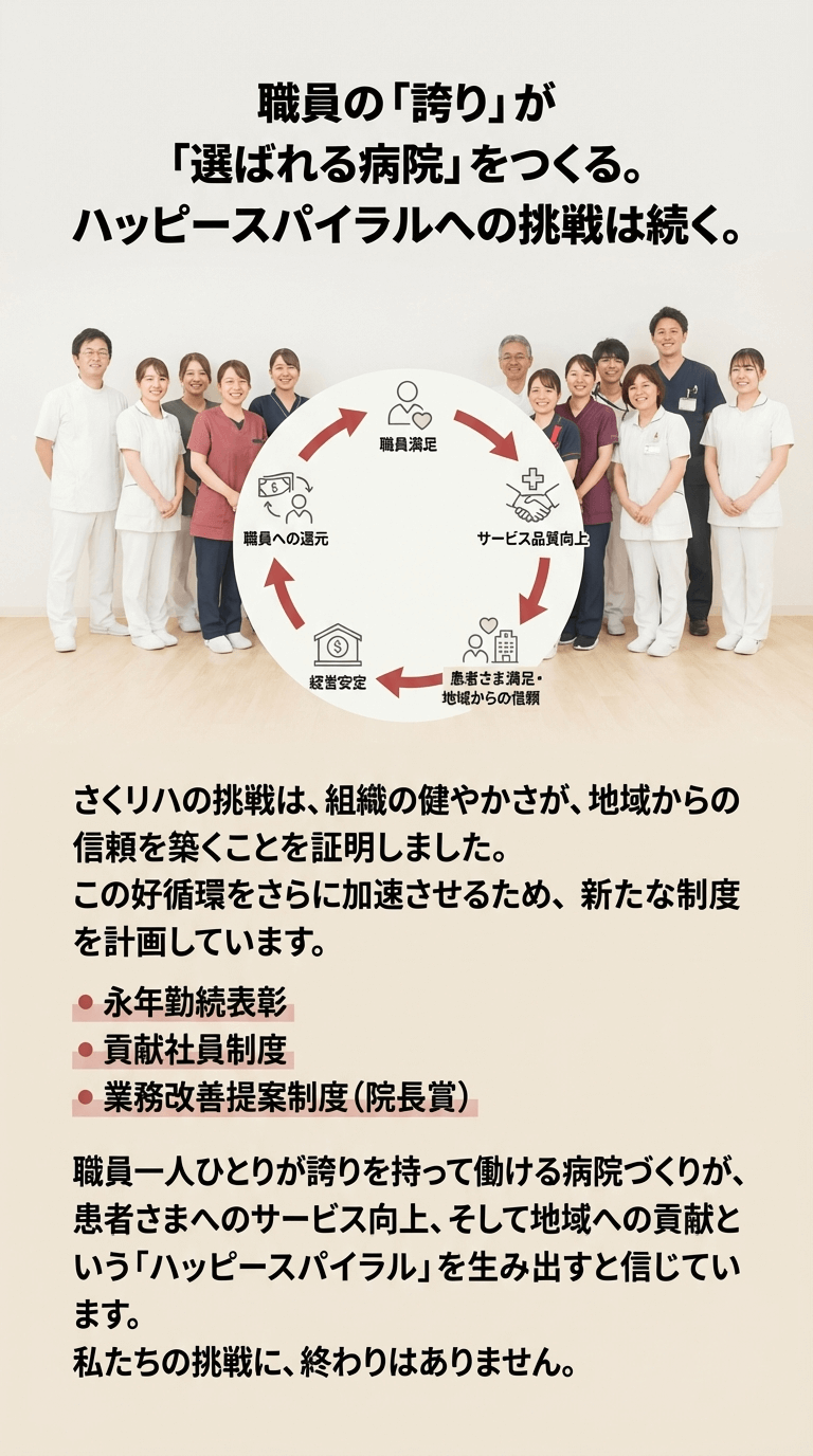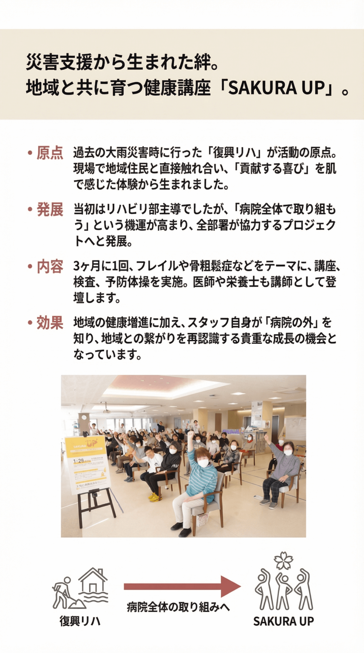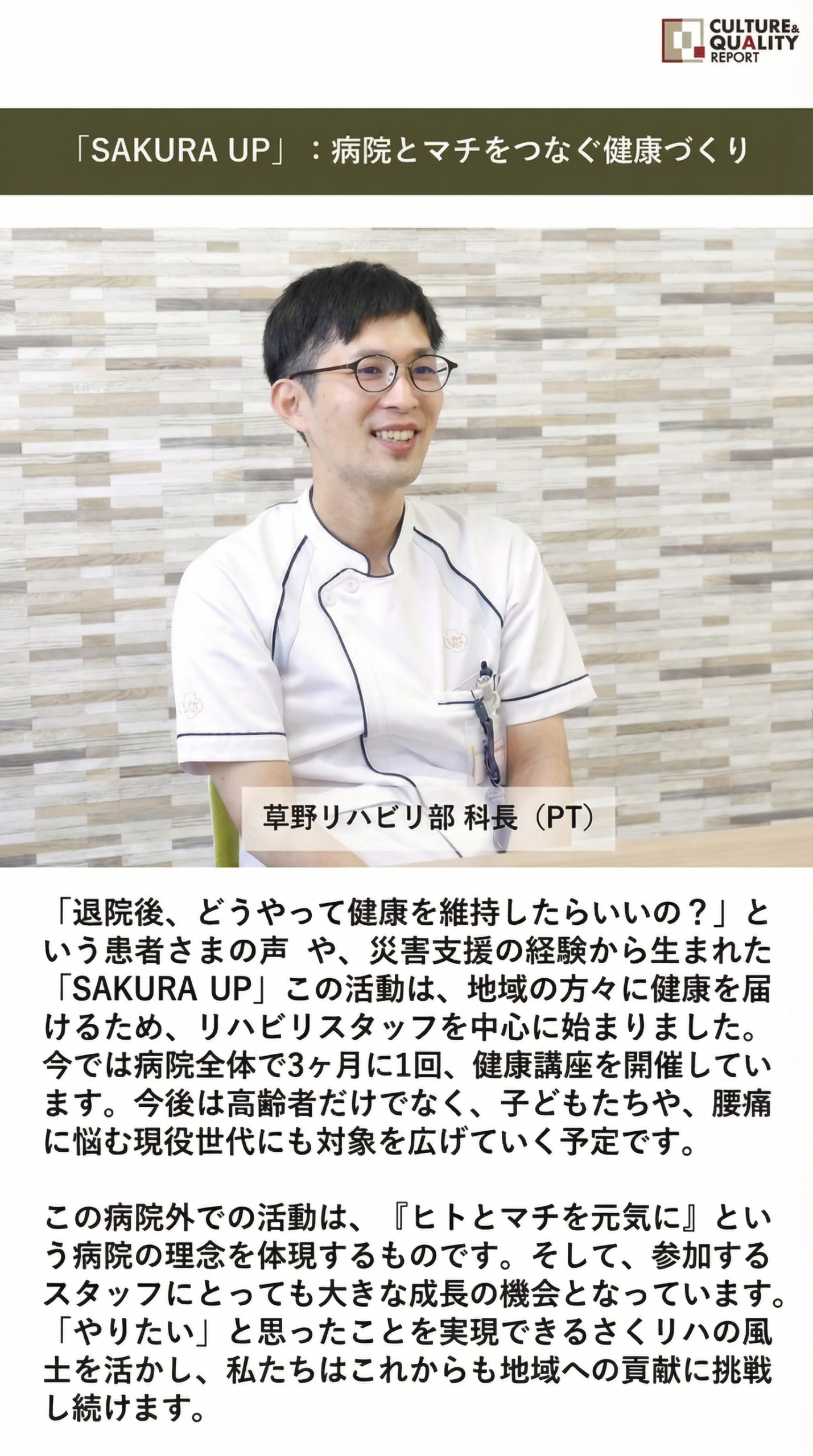 今回はさくリハの好循環として「シン・Careプロジェクトチーム」や「SAKURA UP」、「リハビリ部のインタビュー」、「写真で紹介するさくリハ」などについてご紹介いたします。