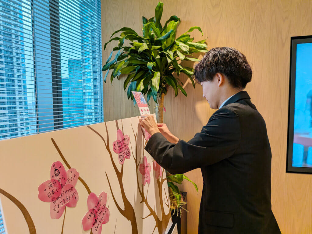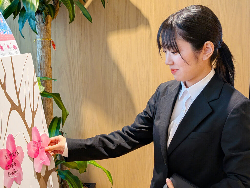 インタビュー後、お2人にはグループで実施している、みんなの夢で桜の木を満開にする企画「WELL-BEINGの花を咲かせよう」に参加していただきました!お2人もそれぞれの夢をカードに書いていただき、夢ボードにペタリ。どんな夢を書いたか気になる方は、ぜひ直接聞いてみてくださいね!