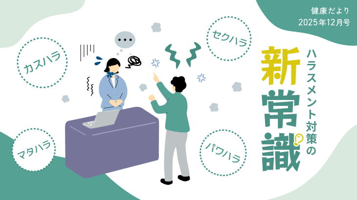健康だより12月号のテーマは… 【ハラスメントが与える影響】です。 12月はハラスメント撲滅月間です。ハラスメントは、知らず知らずのうちに相手の尊厳や人格を傷つけてしまう人権に関わる行為です。実際に職場でハラスメントを経験したことがある人は約3人に1人にのぼると言われており、決して特別な問題ではありません。 この機会に、ハラスメントが心や職場環境にどのような影響を与えるのか、一緒に考え...